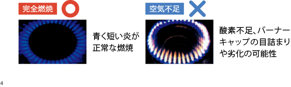 ガスコンロの炎は“青く短い炎”が正常です。一時的に赤く見えても、すぐ青い炎に戻れば問題ありません。換気をしても赤い場合は、バーナーキャップを掃除し、必要に応じて部品の交換や修理を検討しましょう。