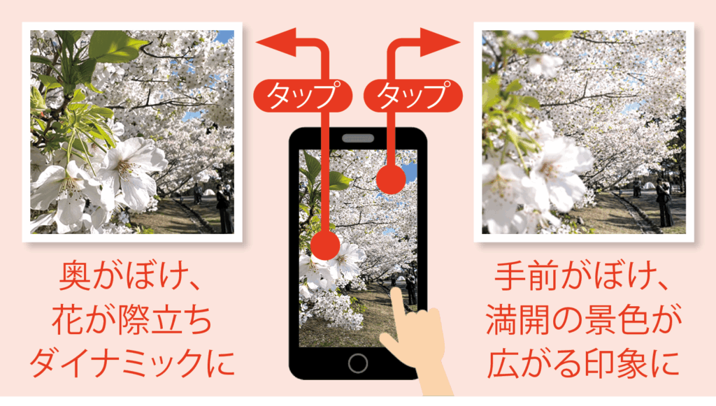 同じ場所、同じ構図でも、ピントを合わせる位置を変えるだけで写真の印象は大きく変わります。スマホのカメラなら1タップでピントが切り替わります。